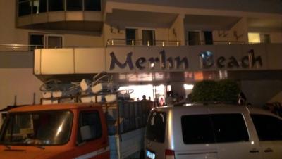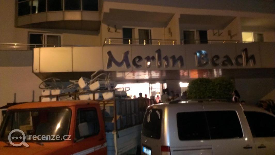 Můžu upřímně a bez okolků prohlásit, že Merlin Beach pro nás připravil neskutečné množství zážitků. Hotel zcelil a seznámil několik rodin dohromady během jediného stravování. Důvod byl jednoduchý. Bylo nedostatek jídla, příborů a místa na sezení. Proto se rodiny museli sjednotit a každý měl během stravování jasně daný úkol. Někdo bral příbory, někdo jídlo a někdo hlídal místa, jinak by se nikdo nenajedl. O ruské klientele raději nebudu ani začínat. Během prvního dne, kdy přestali fungovat výtahy (Merlin Beach pro nás připravili i sportovní dny - vylez do osmého patra, nedej bože, když jsi něco zapomněl v pokoji => jdeš znovu), kávovar, klimatizace v jídelně atd. Zaměstnanci byli líní a nic nedělali (až později jsme zjistili, že jim už tři měsíce nikdo nezaplatil => vůbec se nedivím, že nic nedělali). Nemůžu však vytknou, že i přes své útrapy se nám snažili den zpříjemnit animátoři. Vlez do moře kamenitý a pláž špinavá. Třetí den našeho pobytu, kdy jsme se vrátili z města (koupit si kafe), nás překvapili policisté, kteří hotel "obsadili" a řekli nám, že zkrachoval. Díky tomu máme ovšem mnoho fotek s tureckou policií i s autem se zapnutými majáky. Potom nás šikovná delegátka, která tam přijela okamžitě s autobusem, který nás přepravil do jiného hotelu.