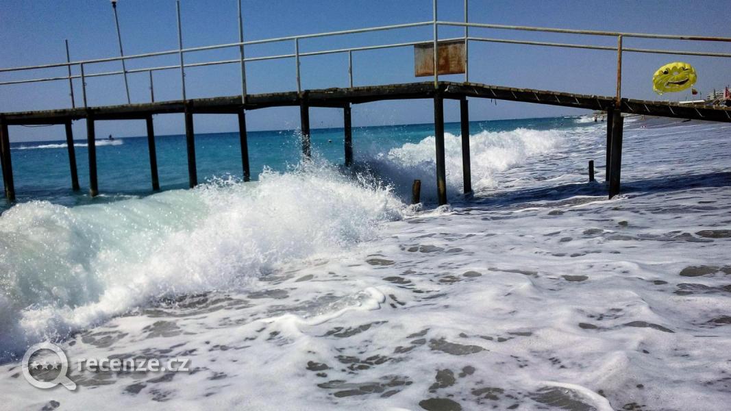 Vzdálenost od hotelu asi 200 metrů.Úplně v pohodě procházka podchodem,kolem Beach baru..a už jste na krásné písečné pláži.Lehátka,slunečníky i osušky,které si můžete denně měnit..zdarma.Vstup do moře je po pláži..když jdete do moře jsou tam i oblázky,ale boty do vody nejsou třeba.nebo můžete jít přes molo po schůdcích,což zvládli i staříci i malé děti.
