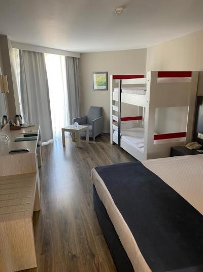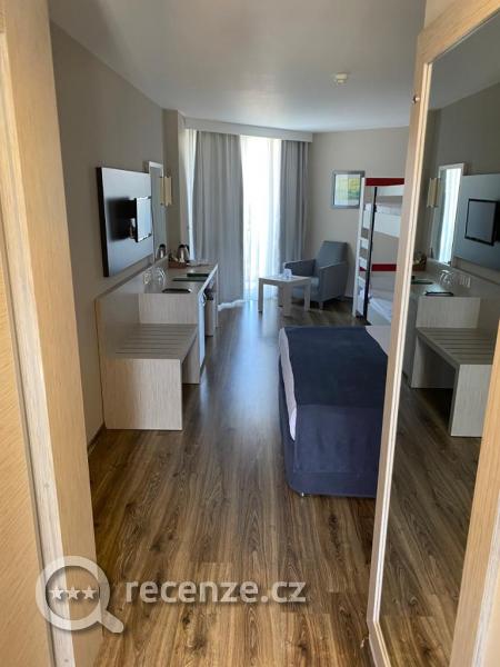 Viděli jsme zde pokoj large 2+2 s palandou a balkonem, standard room s výhledem na moře a family room se 2 ložnicemi oddělené dveřmi.