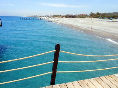 Dostatek lehátek, nemusíte si je ráno pred snídaní obsazovat. Pláž je u lehátek písčitá, u moře kamínky, boty nutné. Molo na slunění nebo skákání do moře.