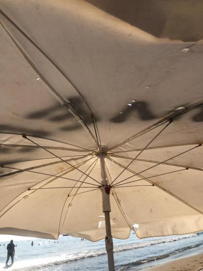 Prakticky namačkané lehátka na lehátko a většina slunečníku zničena prakticky se ani neuklizelo