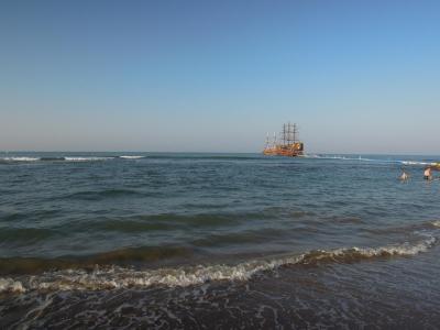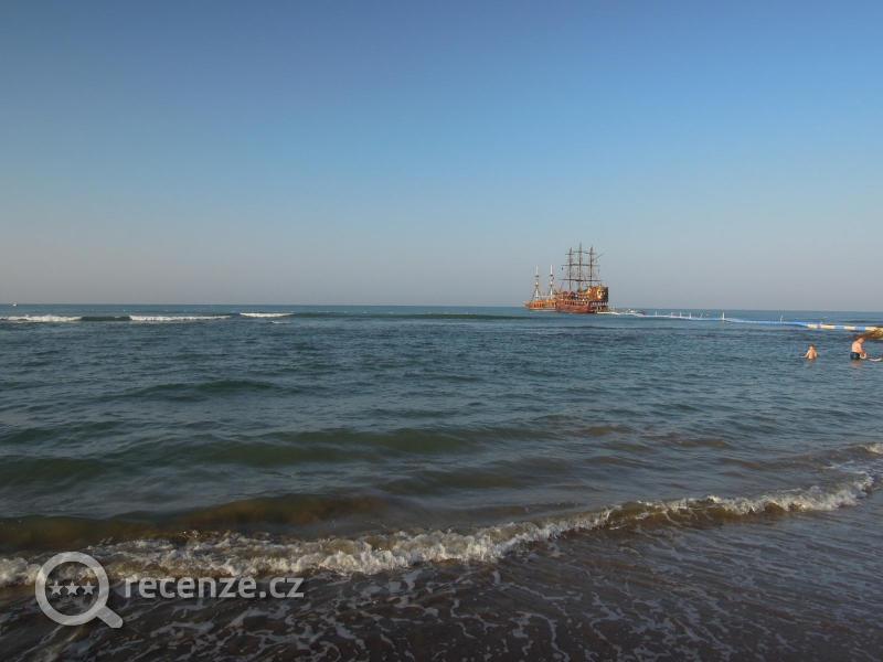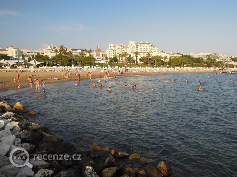 Moře bylo teplé (pobyt jsme měli v srpnu), většinou zakalené pískem. Na okraji chaluhy, které nikdo nodklízel. Tím ale pláž vypadala přirozeněji. Většinou tam volně pobíhalo i několi psů, kteří jsou ale na turisty zvyklí a nijak nerušili. Pláž i moře byly dost přeplněné. Hloubka vody byla do vzdálenosti asi 500 m od břehu většinou tak do 1,6 m. Vhodné pro neplavce a malé děti. Místy byli na dně skály o které se dal lehce ukopnout palec. Když srovnám tuto pláž a Kleopatřinu pláž v Alánii, tak ta je krásnější a také čistější. Ale zase byla dost brzy hloubka. To je ale jen má zkušenost. Byla jsem na jedné pláži v Alánii a na jedné pláži v Side. U každého hotelu to je jiné.