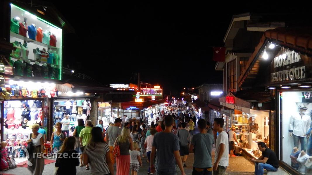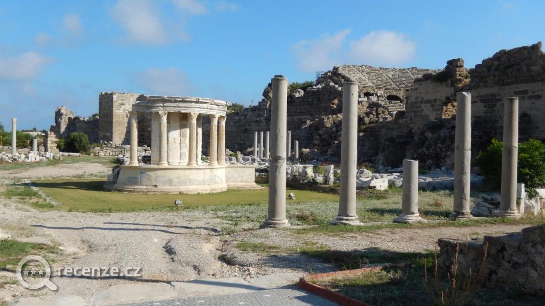 Hotel je z jedné strany na rušnější ulici, z druhé strany klidnější zarostlé prostranství. Z hotelu je blízko do antické části Side, což je super, protože tato část Side je excelentní - zachovalé antické památky ve větším rozsahu, živé centrum plné obchůdků a dobrůtek. Krásné jak ve dne, tak i večer.