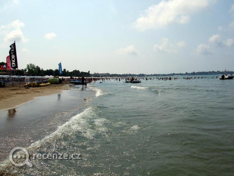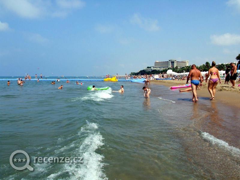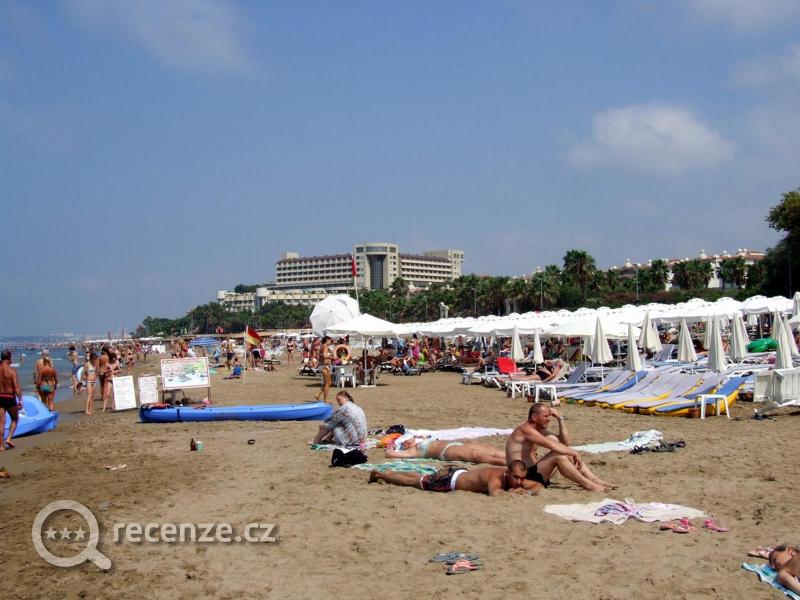 Tak tahle položka se mi líbila nejvíce. Od bazénu do vstupu na pláž bylo asi 25 m, přes širokou promenádu asi 3 m, která vedla do Side. Veliká pláž, široká asi 100 m a dlouhá asi také 100 m (možná 120 m) Slunečníky byly od sebe celkem slušně vzdáleny, takže s dvěma lehátky u slunečníku měl člověk celkem své soukromí. Myslím, že bylo 8 řad slunečníků rozdělených přístupovou cestou dřevěnou rohoží. Na levé straně mohlo být v řadě asi 8 slunečníků a na pravé asi 15 - 17 slunečníků, takže obrovské místo. Po příchodu na pláž vám místní nosič donesl na lehátko podložku a roztáhl slunečník, pokud jste to nestihl dříve. Mezi první řadou slunečníků a mořem bylo dobrých 15 m, takže pokud jste neměl nějaké boty k vodě, tak vás kolem 10 h. už značně pálil písek na chodidla. Teplota se tam přes den pohybovala od 28-35°C, takže sluníčko opravdu písek rozpálilo až moc. Na pláži jste měli k dispozici trojitou sprchu ze studenou vodou (26°C) + dvojitou malou sprškou na omytí nohou, pak drink bar s limonádami - automat na grep,višeň,pomeranč,broskev limonádu a čistou pitnou vodu. Pokud jste si chtěl dát kávu, čaj, nebo mnohé alkoholické nápoje, došel jste si pár metrů, jen tak v plavkách k baru u bazénu, byl to opravdu kousek. Samozřejmě, jste nemusel odcházet na oběd, oproti baru bylo plážové menu od 10:00 a to od hranolků, zeleninových příloh, masových a rybích placek, také palačinky, který vám domorodá paní bryskně udělal na počkání buď s čokoládou, skořicí, nebo se špenátem a že byly dobré, o tom není pochyb. K k hotelu patřila i veřejná toaleta pro dámy a pány nedaleko bazénu, prostě vše co jsem měl potřebu za den si dát, bylo na dosah a v ceně hotelu. Pláž každou chvilku mezi slunečníky uklízeli, prostě bylo čisto! Písek byl na pláži a v moři hrubozrnný a tak tolik nekarboval vodu. Po ránu bylo moře nádherně průzračné a i když jsem byl po prsa ve vodě, jsem si viděl na nohy. Horší to bylo už odpoledne, to už bylo jednak moc lidí a jednak bylo vedle umístěné sport centrum na jízdu s banánem, a čtyř sedákem, také na paragliding za člunem, pokud se správně vyjadřuji a tyto motorové čluny, dost občas zvířily písek mezi koupající se lidi. Ovšem moře bylo značně mělké, 50 m od břehu jsem měl po pas vody a po 100 m jsem vodu po bradu. Teplota vody se pohybovala od 27°C po ránu až po 28-29°C k pozdnímu odpoledni, co teda bylo mimořádně vhodné pro malé děti, jak s teplotou tak s mělkým mořem. Tady můžu říct, to nemělo chybu! ******