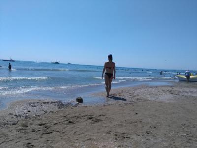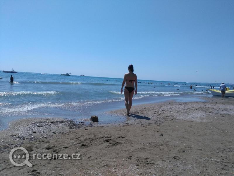 Písečná pláž s pozvolným vstupem, asi 5 minut příjemnou procházkou po promenádě. Čisté moře, velmi teplé moře na přelomu července a srpna 34. Vzduch se přes den pohyboval kolem 38, kolem půlnoci 29.