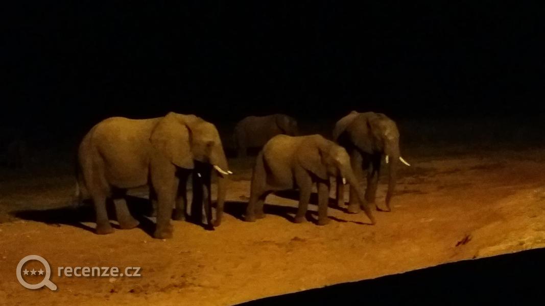 Okolí je to, co nadchne! Napajedlo nedaleko láká zvířata - vzniká tak živé divadlo po celý den. Stačilo by jen sedět, popíjet drink a sledovat tu krásu. Večerní představení pak připravilo stádo slonů, které se šlo nakrmit přímo k vyhlídce na okraji pozemku, takže byli sloni doslova na dosah.